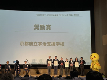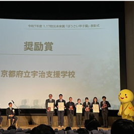 このたび、宇治支援学校は「1.17防災未来賞 ぼうさい甲子園」において、奨励賞を受賞しました。表彰式は1月24日(土)に兵庫県の「人と防災未来センター」で行われ、兵庫県知事をはじめ、多くの来賓の方々が出席されました。