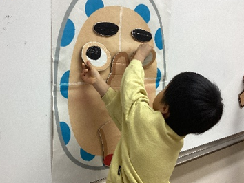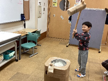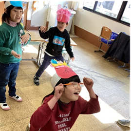 クリスマスにはツリーや飾り、お正月には凧、節分には豆入れ等、題材は違いますが、素材の質感や色等を感じて工夫しながら季節の制作を行いました。節分が近付くと、制作したお面を被って、鬼に扮した子ども達が教室や廊下に「鬼だぞー」「ガオー」とたくさん登場しています。