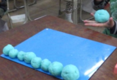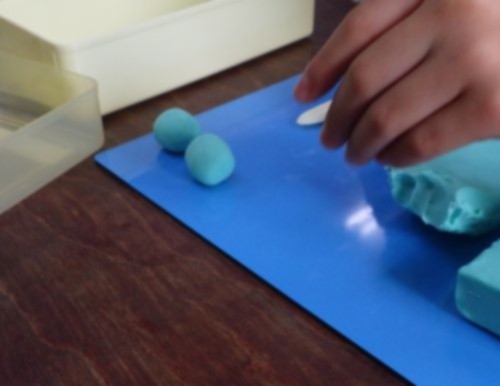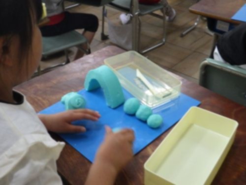 1年生は、図工の時間に粘土の学習です。油粘土の感触を楽しみながら、丸める、伸ばす、ちぎる、積むといった基本的な動作を使って、いろいろな形をつくっていました。