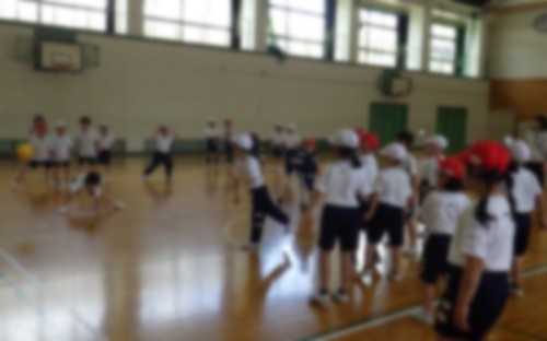 2年生は体育館で体育の学習です。2チームに分かれてドッジボールを行っていました。相手にボールを当てようとしたり、キャッチしようとしたり、すばやくよけたりするなど、機敏に動く姿が印象的でした。
