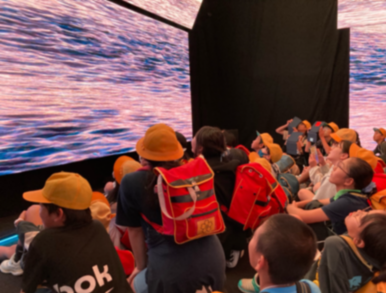 パビリオンの前半では、オーストラリアに生息している動物や生き物が映し出されていました。映像の中に「6匹隠れているよ」というスタッフの方の声を聞いて、みんな一生懸命探していました。他にも「ツリーフロッグ」(木に住むカエル)のくわしい説明もありました。パビリオンの後半は、360度に広がる大画面での映像を見ました。次々と変わる映像や、迫力のある音に5・6年生児童はとても感動している様子でした。