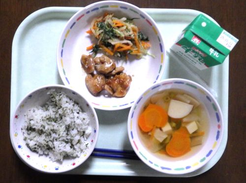 碾茶ごはん 牛乳 すまし汁 鶏肉の古老柿だれ 宇治田原野菜の柿酢和え