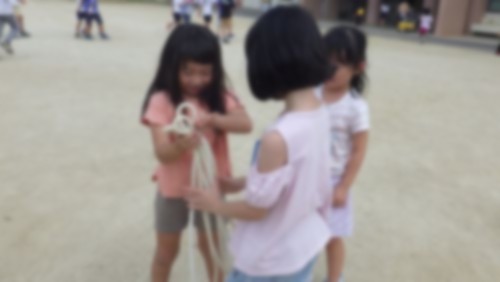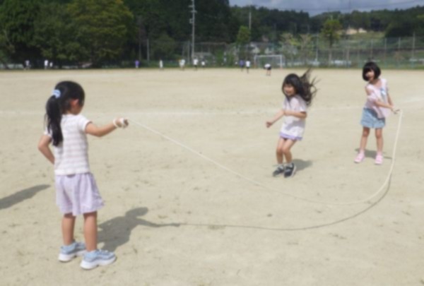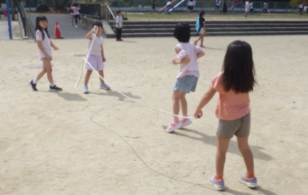 休み時間になると、運動場では元気に「八の字跳び」に挑戦する児童の姿がよく見られます。