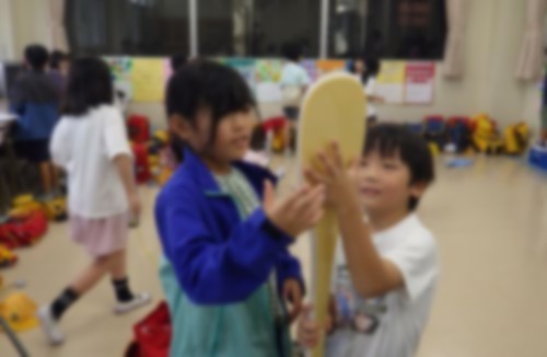 また、実際に使われている「しゃもじ」「おたま」「ざる」を見せていただき、その大きさに児童は驚いていました。