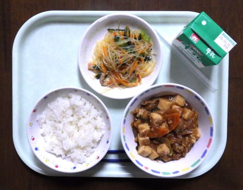 今日の献立に「バンサンスー」があります。細く切った3種類の食材と春雨を組み合わせて作る、中華風の酢の物です。中国語で「バン」は混ぜ合わせる、「サン」は数字の3、「スー」は糸のように細く千切りするという意味があることから、この名前が付けらているそうです。中国の伝統的な料理なので、学校給食では中華の献立の日によく登場します。さっぱりとして食べやすいので、ひそかに人気のある献立のようです。今日の献立には、ごはんとマーボー豆腐もあります。マーボー豆腐は、1学期に献立に登場した時と同じく、学年に合わせて辛さを3段階に分けて作っていただいています。これもごはんが進む人気の献立の一つです。