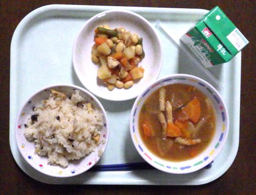 今日の給食は「きのこごはん」です。秋が旬のきのこを使った炊き込みごはんです。きのこは、しめじ、えのき、しいたけの3種類を使っています。しいたけは、宇治田原町で採れた「原木しいたけ」を使っています。原木しいたけは、ナラやクヌギなどの伐採した木の「原木」に、直接しいたけの菌を植え付けて、自然の環境でじっくり育てて作ります。木の養分を分解して育っていくので、香りが強く、肉厚で、風味が豊かなのが特徴です。収穫されるまでに時間がかかることと、気候の影響を受けやすいので、安定して作るのが難しく、一般の店に出回ることの少ない貴重な食材です。そんな食材が宇治田原町で作られているなんて、誇らしいですね。生産者の方のおかげでおいしいしいたけを給食で食べることができています。