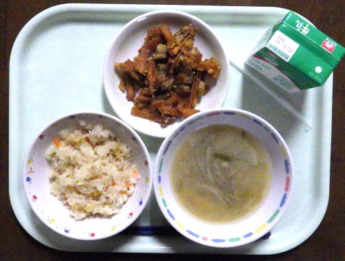明日、11月8日は「いい歯 の日」です。それにちなんで、今日の給食はよくかんで食べてほしいという願いを込めた献立にしました。「根菜と板ふのカミカミ和え」は、名前の通り、噛み応えのある料理です。板ふ、ごぼう、れんこんを油で揚げて、手作りの甘辛いタレと絡めて、仕上げています。ごぼうとれんこんは、秋から冬にかけて旬を迎える野菜です。根の部分を食べる野菜なので、「根菜」の仲間です。根菜は食物せんいが豊富で、お腹の調子を整える効果があるそうです。また、身体を温める効果もあるので、寒い季節にぴったりの食材です。