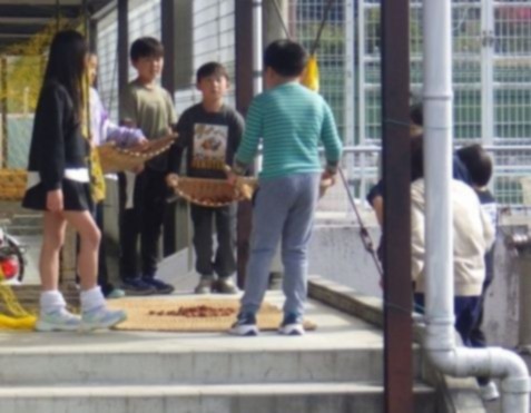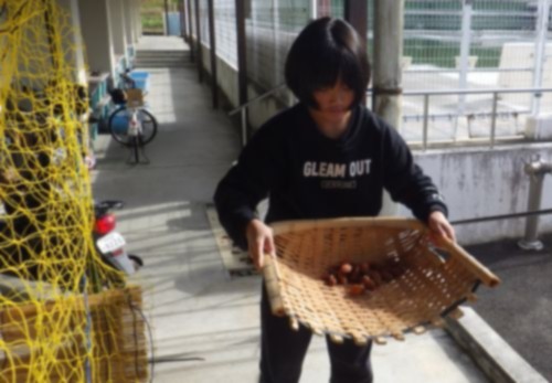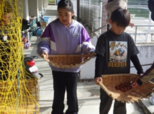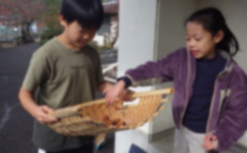 11月11日(火)、乾燥しすぎる前に、3年生の子どもたちが箕(み)を使って柿を転がす「ヒル」という作業を行いました。この「ヒル」作業は、箕の上で柿をコロコロと転がすので「ころ柿」という名前の由来とも言われており、ころ柿づくりに欠かせない大切な工程です。