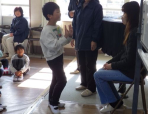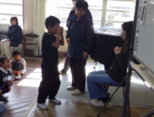 次に、グループに分かれてジェスチャー(身振り)によるコミュニケーション体験を行いました。「サッカー」「カニ」「ゴリラ」「ウサギ」「バスケットボール」「めがね」など、身振りだけで言葉を伝える活動に挑戦し、伝わったときの喜びを感じていました。