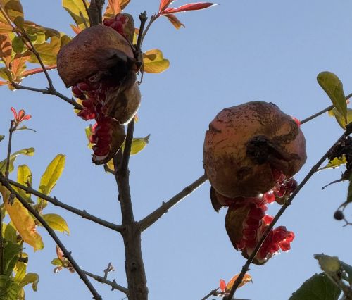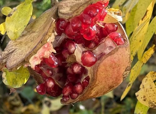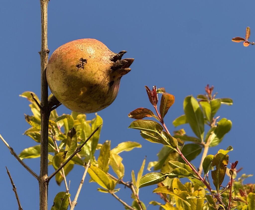 校内にある「ザクロ」の木に、いくつかの大きな実が育っています。よく見ると、皮がはじけて中から赤いつぶつぶの果肉が顔をのぞかせているものもあります。