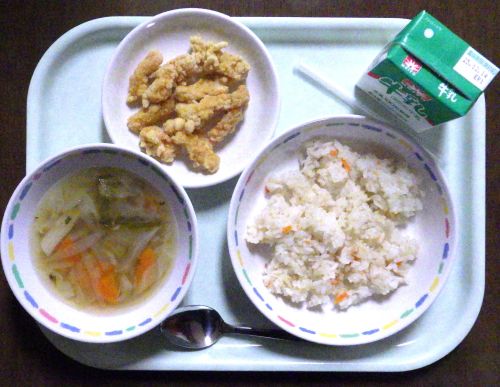 今日の給食は「イカのカレー揚げ」です。食欲をそそるカレー味の献立です。しょうゆとカレー粉で下味をつけたイカに、片栗粉をつけて油で揚げてあります。イカには、たんぱく質、タウリン、ナイアシン、ビタミンEなどの栄養が豊富に含まれています。疲れを取る、肌をきれいにする、血圧を正常に保つなどの効果があるので、体調を整えたいときにうってつけの食材だそうです。噛み応えがあるので、給食ではよくかんで食べてほしいという願いを込めて献立に入れることがあるようです。