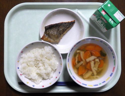 サケのレモン焼き 牛乳 ごはん たぬき汁