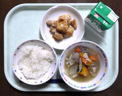 今日の給食今日は食育の日で、「冬至」にちなんだ給食献立になっています。冬至は、1年で最も日が出ている時間が短い日です。今年の冬至は12月22日です。食べ物の名前に「ん」がついているものを食べると縁起が良いと言われていたり、ゆず湯に入って体を温めたりする風習もあります。今日の献立には、「れんこん、にんじん、かぼちゃ(別名 がなんきん)」が使われ、うま味たっぷりのみそ汁になっています。