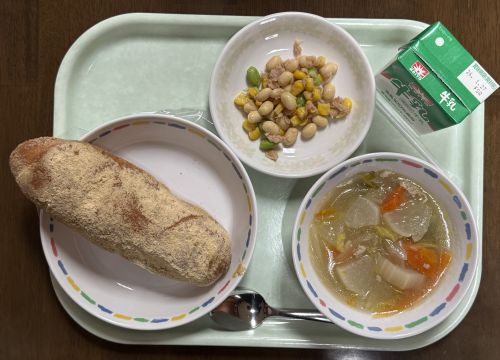 献立:冬野菜のスープ煮、牛乳、きなこパン、まめまめサラダ