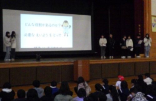1月20日(火)きずな集会で、給食委員会の児童が全校児童に向けて、給食週間(1月23日~30日)の意味や取組などについて発表を行いました。発表では、給食が始まった理由や給食の役割について分かりやすく説明し、給食が子どもたちの健康や成長を支えてきたことをあらためて学ぶ機会となりました。