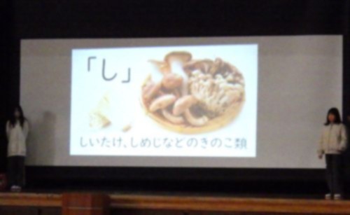 また、今年の給食週間のテーマ「食べて元気に!まごわやさしい給食」について紹介し、「ま・ご・わ・や・さ・し・い」にあてはまる食材や、それぞれの栄養のはたらきについて説明しました。児童にとって身近な給食のメニューを例に挙げながら話すことで、バランスのよい食事を心がける大切さを伝えることができました。