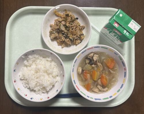 今日の給食今日の給食は、「春雨スープ」と「豚キムチ」です。 春雨はつるりとした食感で、野菜と合わせると食べやすく、ごま油の香ばしさも感じるおいしいスープです。豚キムチは、キムチの辛味が控えめで食べやすく、ごはんがとても進む献立です。春雨スープに入れられている「生姜」と、豚キムチにある「キムチ」が体をぽかぽか温めてくれます。朝からとても気温の低い今日の寒さにピッタリの献立です。