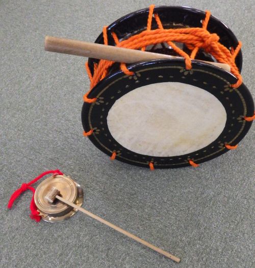 子どもたちは、初めて手にする太鼓や鐘を大切に扱いながら、心地よい音色を楽しんだり、元気よくかけ声をかけたりして、保存会の皆様と一緒にお囃子を演奏しました。