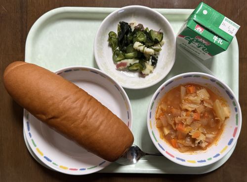 今日の給食は、「ボルシチ」と「海のミネラルサラダ」、主食は「味付 けパン」です。 ボルシチはウクライナ生まれの料理で、鮮やかな色合いが特徴のスープです。本場ではビーツという野菜を使いますが、給食では、キャベツ、タマネギ、ニンジン、じゃがいもなどの食べやすい野菜を組み合わせて作られています。少し酸味のある味わいが、野菜と肉のうま味を引き立てるそうです。海藻を使ったサラダはミネラルが豊富に含まれているので、献立名も海のミネラルサラダとなっているようです。