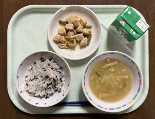 献立:十六穀わかめごはん、牛乳、きゃべつのみそ汁、高野豆腐の煮物