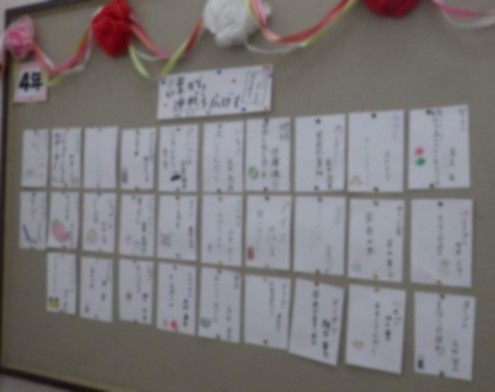 どの作品も発想豊かで、それぞれの思いが感じられる表現です。現在、4年生の作品は校舎階段の踊り場にある掲示板に掲示しています。その中から、いくつかの作品を紹介します。子どもたちの自由な発想の面白さが伝わってきます。