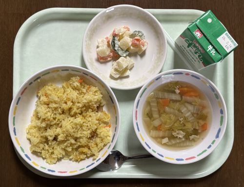 献立:マセドアンサラダ、牛乳、カレーピラフ、はくさいスープ