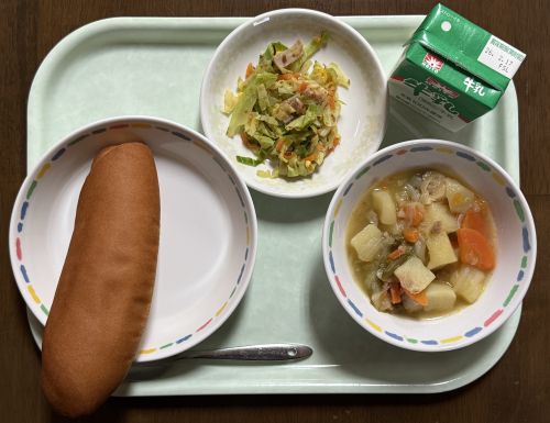 献立:じゃがいものベーコン煮、牛乳、コッペパン、元気サラダ