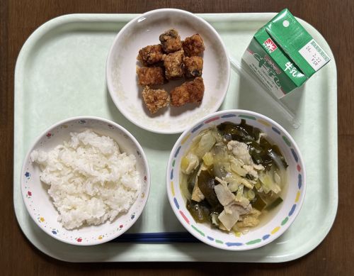 献立:玉ねぎのみそ汁、牛乳、ごはん、カジキの揚げ煮