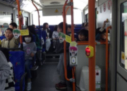 その後は運動場に移動し、バスの乗車体験を行いました。町が運行する「ハートバス(茶ッピー号)」と、京都京阪の「路線バス」の2種類に実際に乗車し、それぞれの乗り降りの仕方や運賃の支払い方法等について学びました。