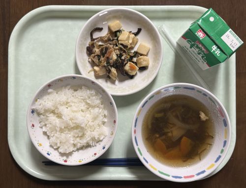 献立:チャンプルー、牛乳、ごはん、もずくのスープ