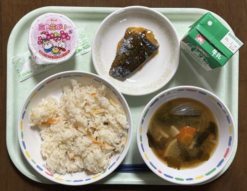 献立:さわらの甘辛だれ 牛乳 ちらしずし 赤だし 3色花ゼリー