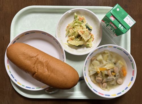黒糖パン 牛乳 パスタサラダ スープ煮