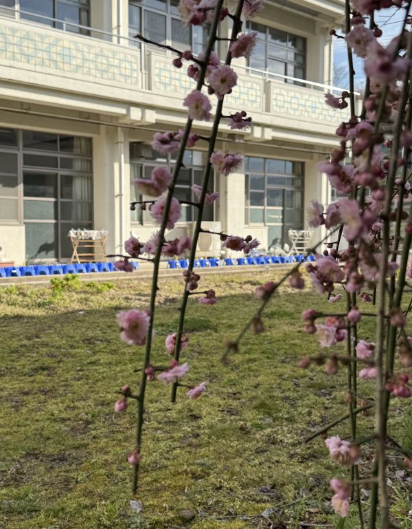 正門入ってすぐにある校舎「なごみ棟」の周辺にある桜が花を咲かせています。中庭のしだれ梅もきれいに花を咲かせています。6年生の門出をお祝いしているかのようです。