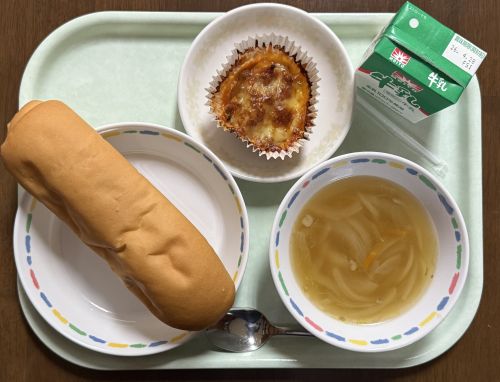 献立:オニオンスープ、牛乳、小麦パン、ポテトのミートグラタン