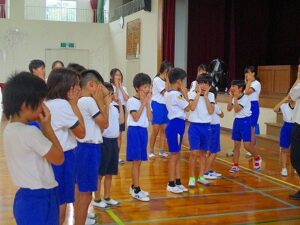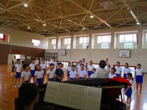 10月14日(火)は久しぶりの全校練習でした。前回の練習から間隔も空いた3連休明けでもあり、この日はみんなでピアノの周りに集まって声を出してみました。