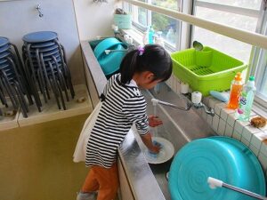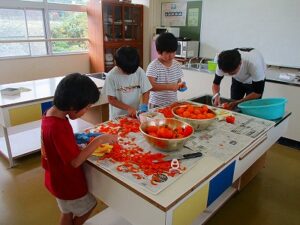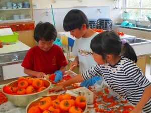 1,2年生とわかあゆ学級のみんなで金曜日に収穫したたくさんの柿を10月20日(月)は朝から皮むきです。