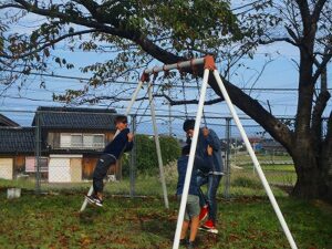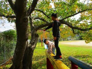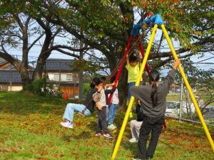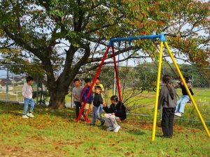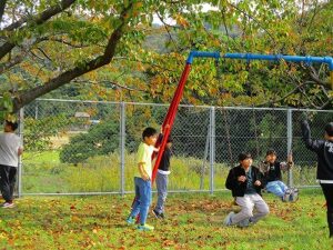 授業終わりのチャイムが鳴ると児童玄関から走り出てくる子ども達がまず向かうのは校庭の端にあるブランコです。その後、人数が集まると「鬼ごっこする人~」の呼びかけ。