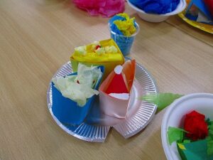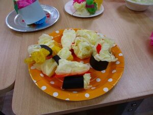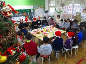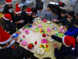 プレゼント交換が終わったら、1,2年生が用意したたくさんの御馳走(折り紙で作ったケーキやラーメン、お寿司やチャーハンなど)を囲んで、食べたり話したり…みんな、本当においしそうに食べて見せるので、本物が並んでいるのではないかと思ってしまうくらいでした。ほんの20分間でしたが、なぜかとてもゆったり時間が流れていたような気がしたのはそれだけ和かな雰囲気だったからでしょうか。見守る教職員にとっては、そうした子ども達の姿が何より最高のプレゼントでした。