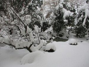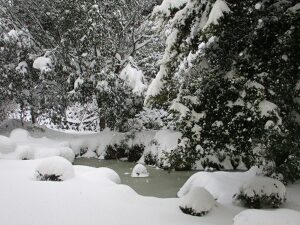 赤い花が咲き始めていた中庭の梅の木も、ザリガニのいる池も真っ白です。