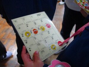保育所のみんなは用意してもらった探検カードを首から下げ、校舎内のいろいろな場所を回ってはシールをはってもらいます。