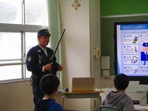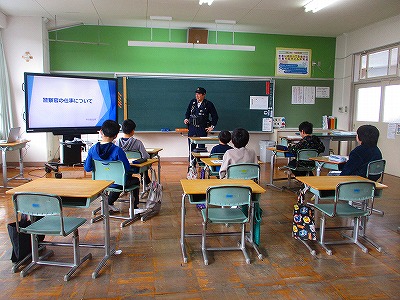 1月29日(木)は3年生の社会科の時間に、宇川駐在所の駐在さんに来校いただき、警察や警察官の仕事についてお話を聞かせていただきました。
