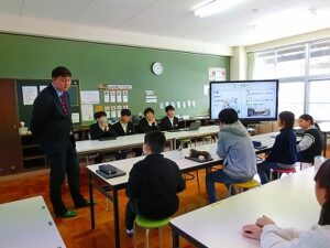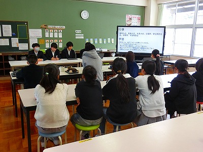 2月5日(木)の6時間目は、宇川小学校の卒業生である丹後中学校1年生の生徒(代表4名)が宇川小学校に来て、5,6年生を対象に中学校に入学してからの日々の中で感じたこと、学んだことについて話を聞かせてくれました。