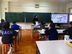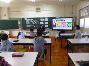 給食週間の一環で、2月12日(木)の2,3時間目は、栄養教諭の先生に来ていただき食育の授業を受けました。