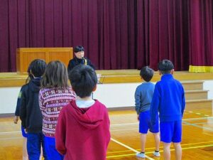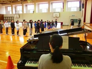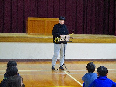 いつもはピアノ伴奏で歌っている校歌ですが、この日は先生のサックスに合わせて歌いました。体育館に響くサックスの音を楽しみながら、いつもと少し違った気分で校歌を楽しみました。