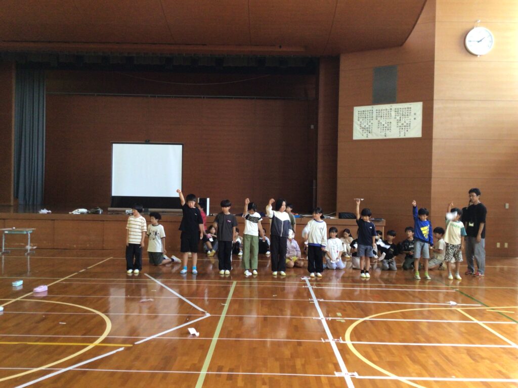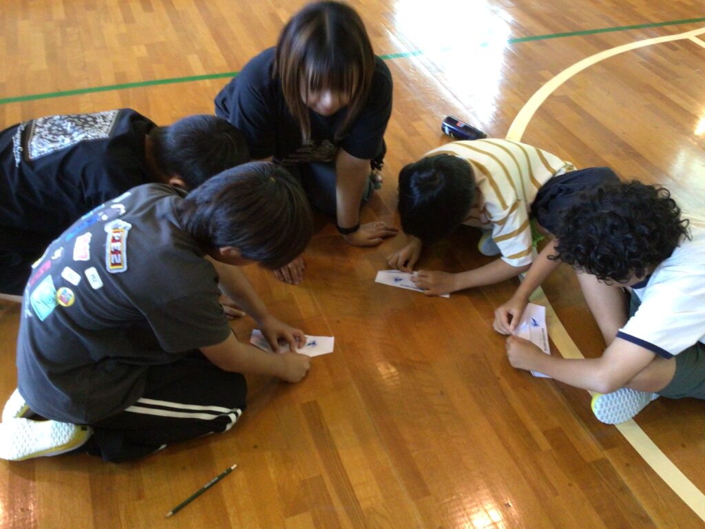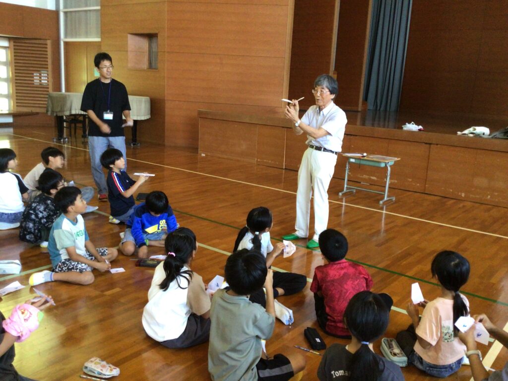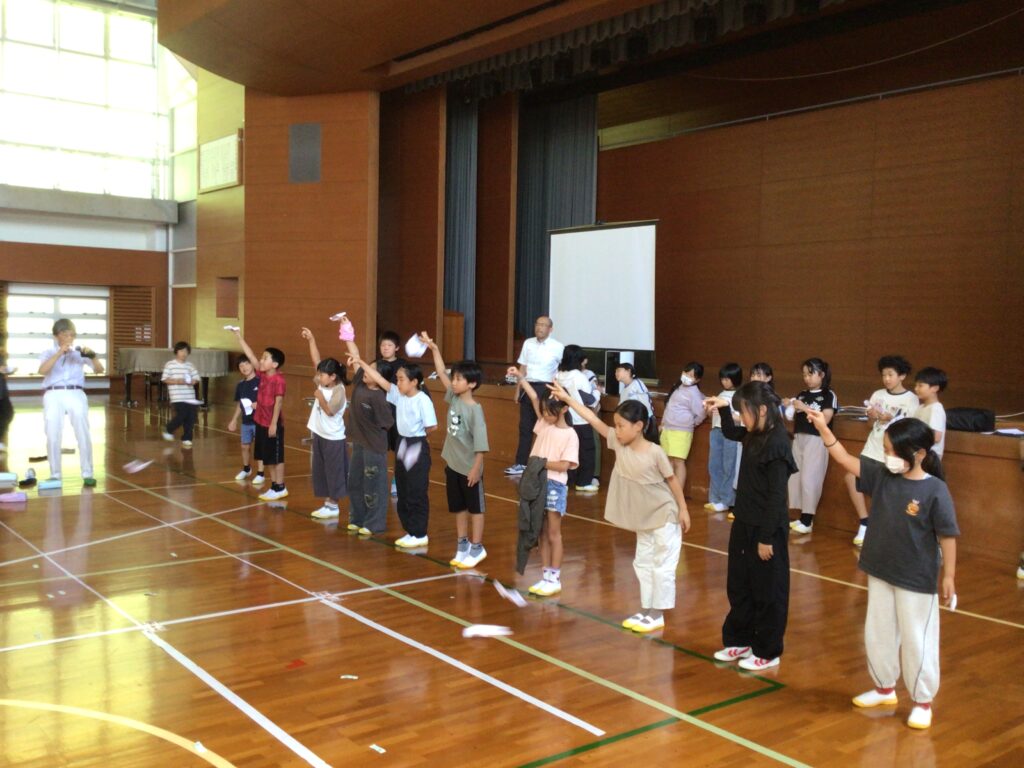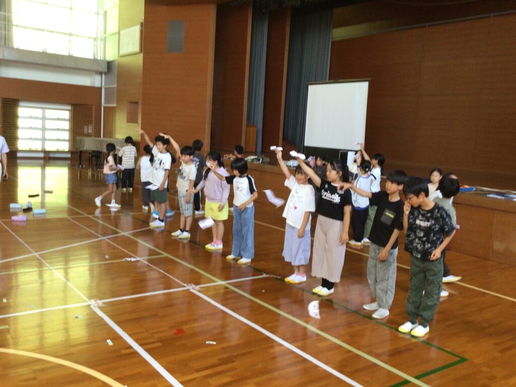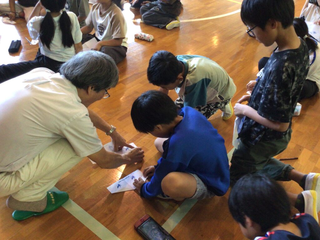 子どもの知的好奇心をくすぐる体験授業として九州大学名誉教授 小田垣 孝先生をお招きし、学3・4年生が紙グライダーを作り、飛行大会に挑戦しました。どうしたら遠くまでグライダーを飛ばすことができるのか、試行錯誤しながら班の友達と相談し、調整をしていました。