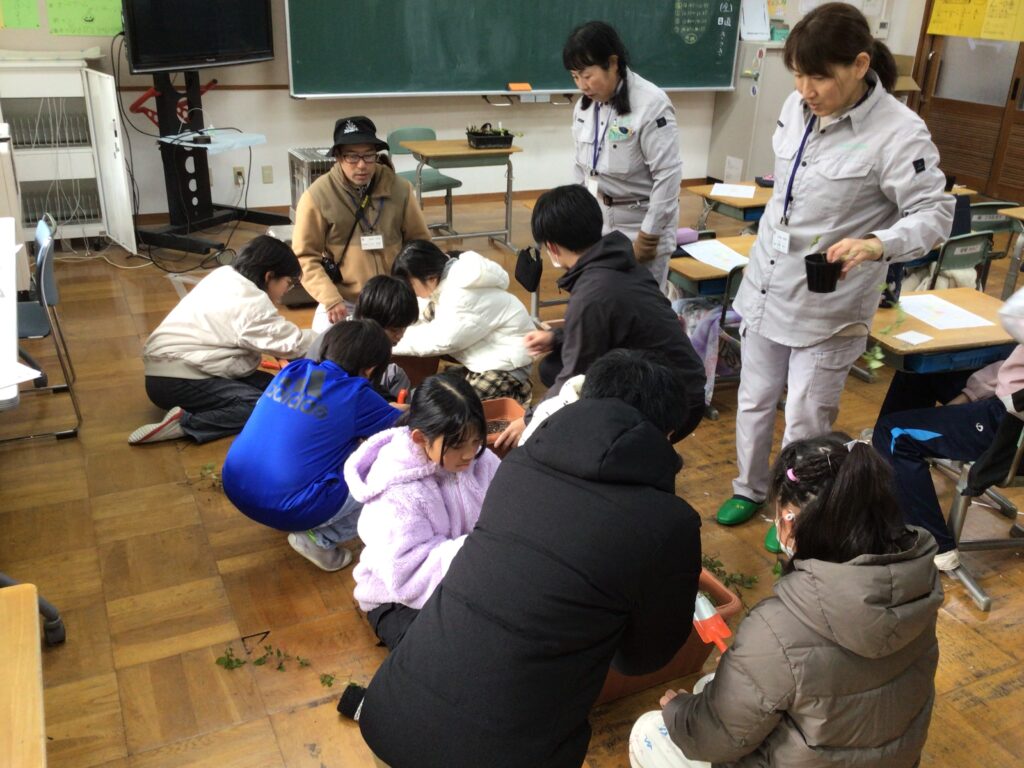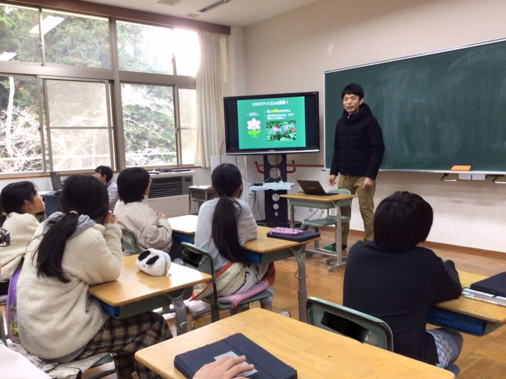 12月12日には、京都府立植物園と京都大学からゲストティーチャーに来ていただき、5年生が和知小学校のユキミバナのひみつについて学びました。また、育て方についても学び、観察のためにユキミバナの採取(京都府知事に届出済)と植え付けを行いました。