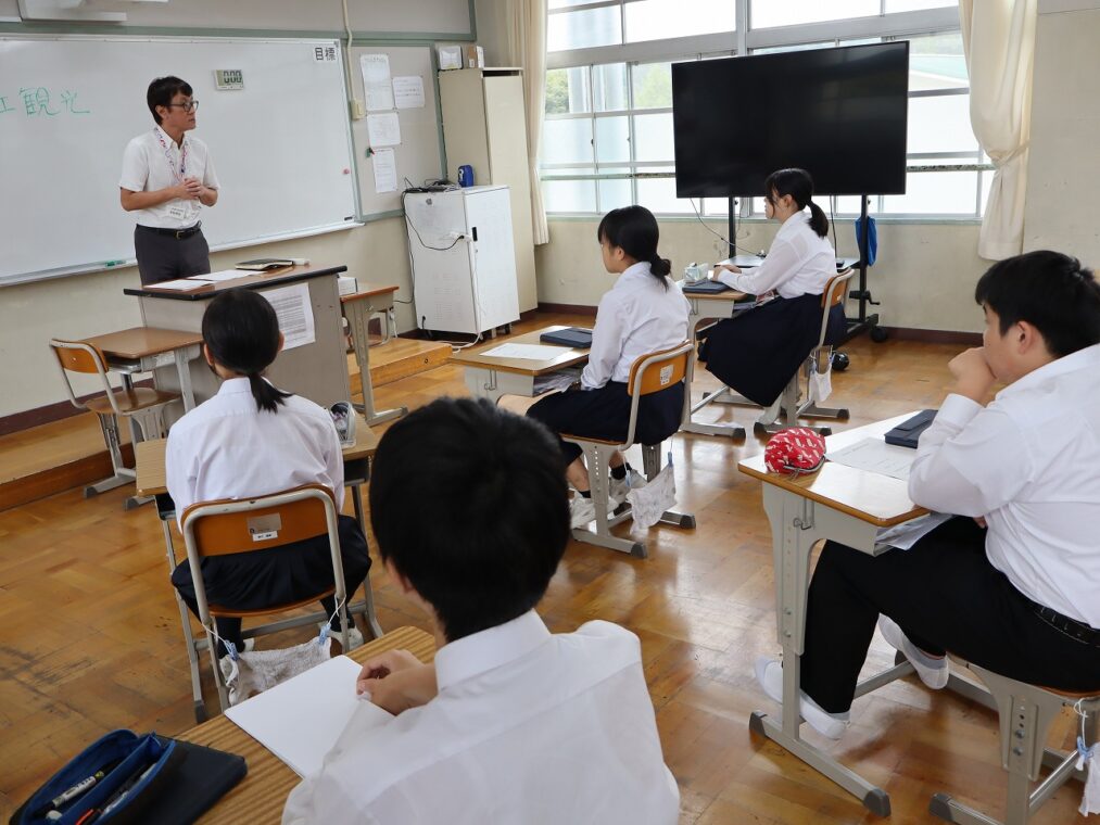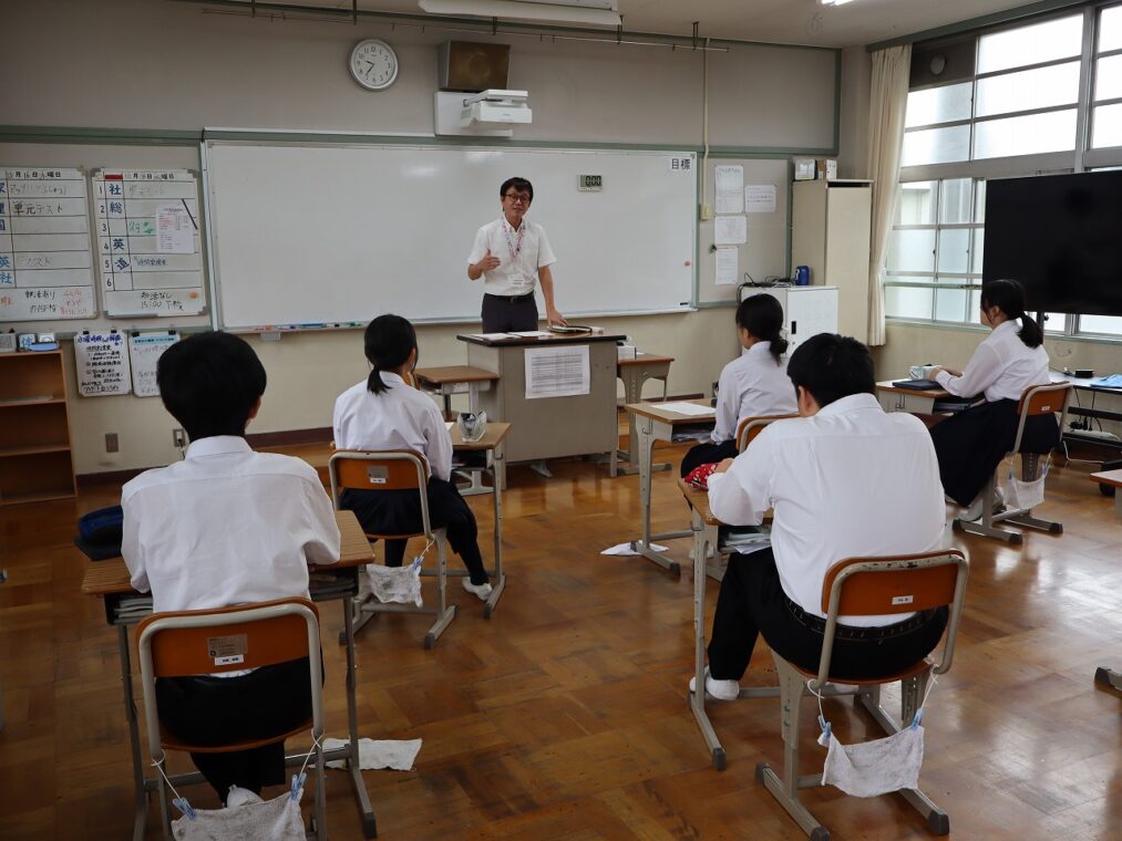 2年生は、来月5日から三日間、町内の事業所で職場体験活動を行います。その事前学習として京丹波町役場商工観光課の片山さんにお越しいただき、働くこととはどんなことか、京丹波町内での経済活動や役場の仕事などについてお話いただきました。民間企業と公務の違いなど、なるほどと思うことをたくさん学ぶことができました。