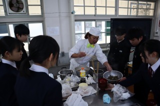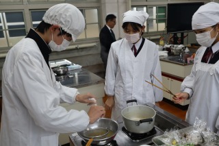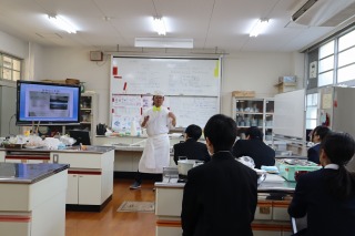 京都府の体験型食育事業の一環として、しょく育先生の一人「あらい ぷらんにんぐ」の荒井さんを講師としてお招きし、世界遺産としての和食の学習と昆布と鰹節を使った本格的な出汁の取り方を実習しました。世界的にも人気となっている和食の優れたところや、家庭の味が失われつつある現状などについても考えました。その後班に分かれて出汁をとり、野菜をいれたすまし汁を作りました。手間暇かけて出汁をとるとひと味もふた味も変わることを実感しました。ぜひ家でもチャレンジしてみてください。