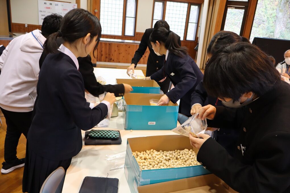 生徒会が中心に取り組んでいる「銀杏プロジェクト」。乾燥も終わり、今日は袋詰め作業を行いました。生徒会本部役員が説明したり、指示したりしながら、流れ作業で効率よく進みました。さすがのリーダーシップとそれをきちんと協力できるフォロアーシップは、和知中生徒会のすばらしいところですね。銀杏の注文、12月24日(金)まで受付中です。