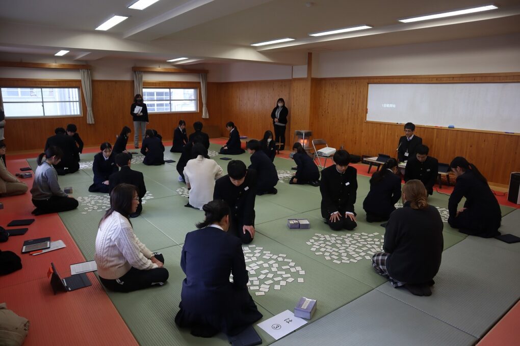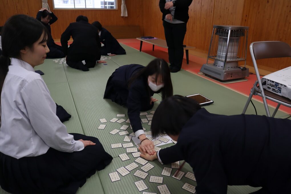 毎年恒例の百人一首を使ったカルタ会を実施しました。全部で3回戦を行い、個人戦と学級対抗で競いました。冬休み中にしっかり練習してきた人もいるなど、例年とても盛り上がります。あちこちで歓声が上がり、楽しみながら平安の世界を堪能しました。優勝争いはわずかな差を制して2年生男子が勝ち取りました。企画・運営を担った文化委員の皆さん、ありがとうございました。